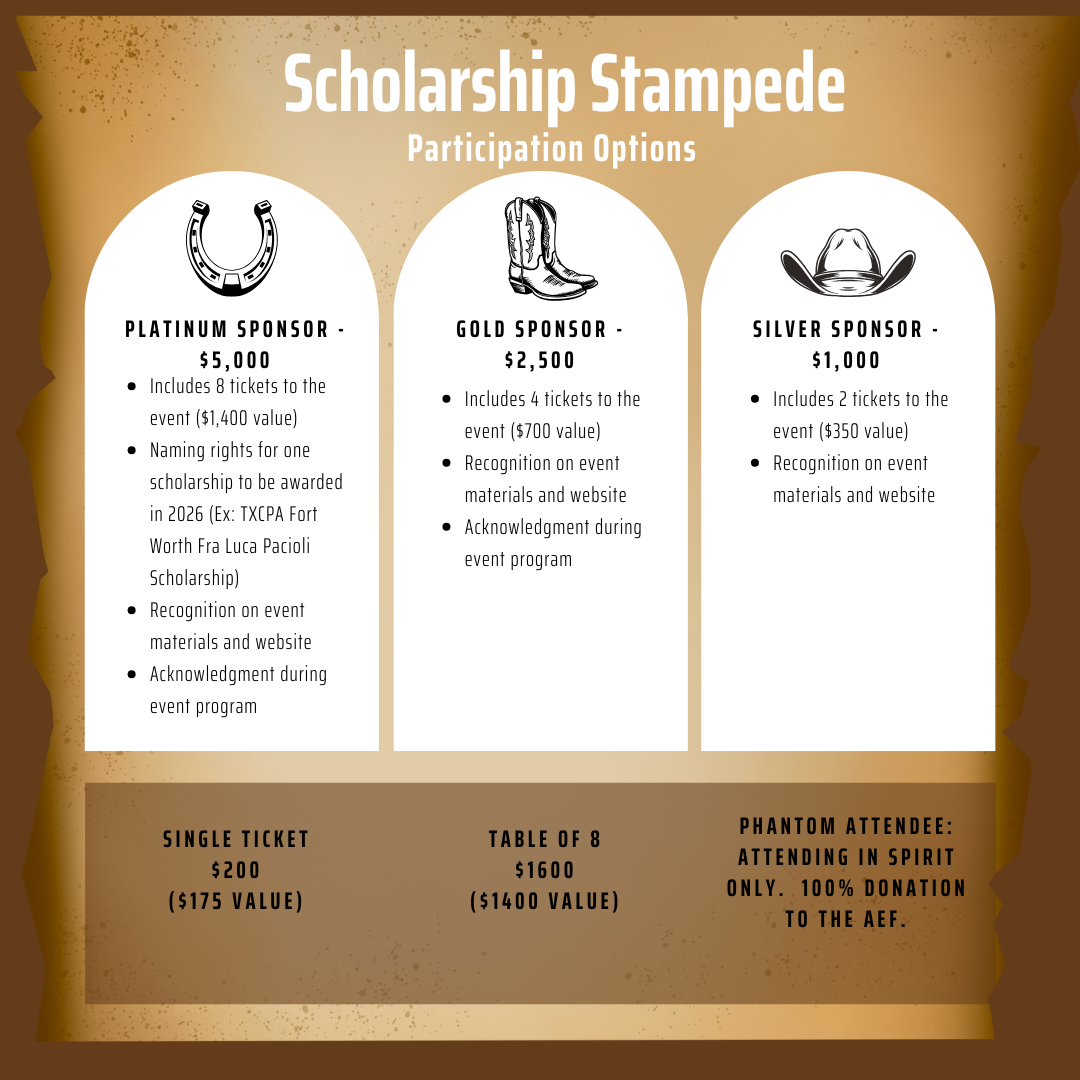 - Naming rights for one scholarship to be awarded in 2026 (Ex: TXCPA Fort Worth Fra Luca Pacioli Scholarship)