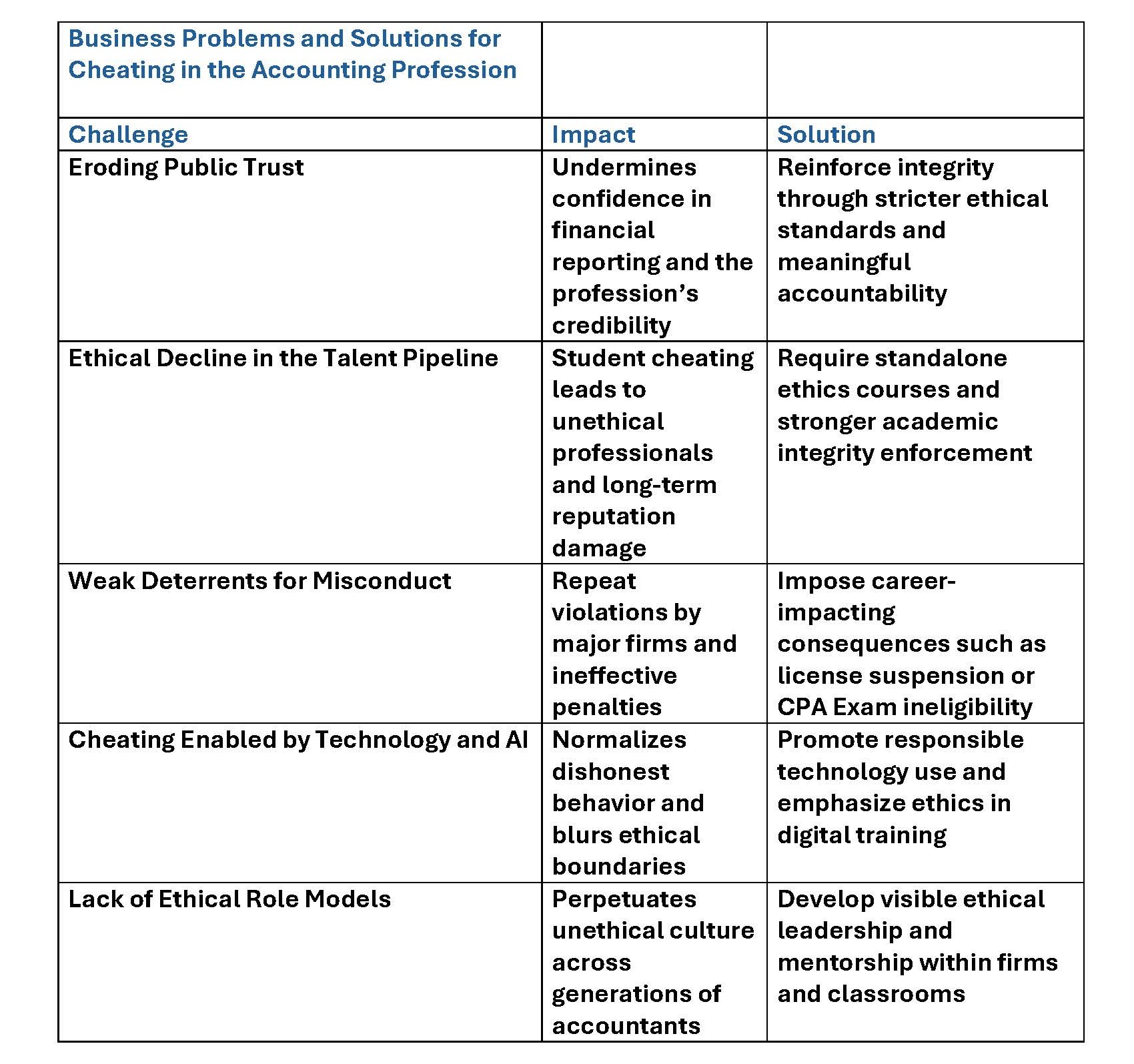 4. Bierstaker, J., Brink, W. D., Khatoon, S., & Thorne, L. (2024). Academic fraud and remote evaluation of accounting students: An application of the fraud triangle. Journal of Business Ethics, 1-23; Fritz, A., Emerson, D. & Smith, K. (2024). Cheating in the Profession, Insights from Academia. The CPA Journal, Retrieved from https://www.cpajournal.com/2024/06/06/cheating-in-the-profession; Accountancy Age. (2025). Ethics in accounting: Can firms restore public trust? Accountancy Age. Retrieved from https://www.accountancyage.com/2025/01/21/ethics-in-accounting-can-firms-restore-public-trust.